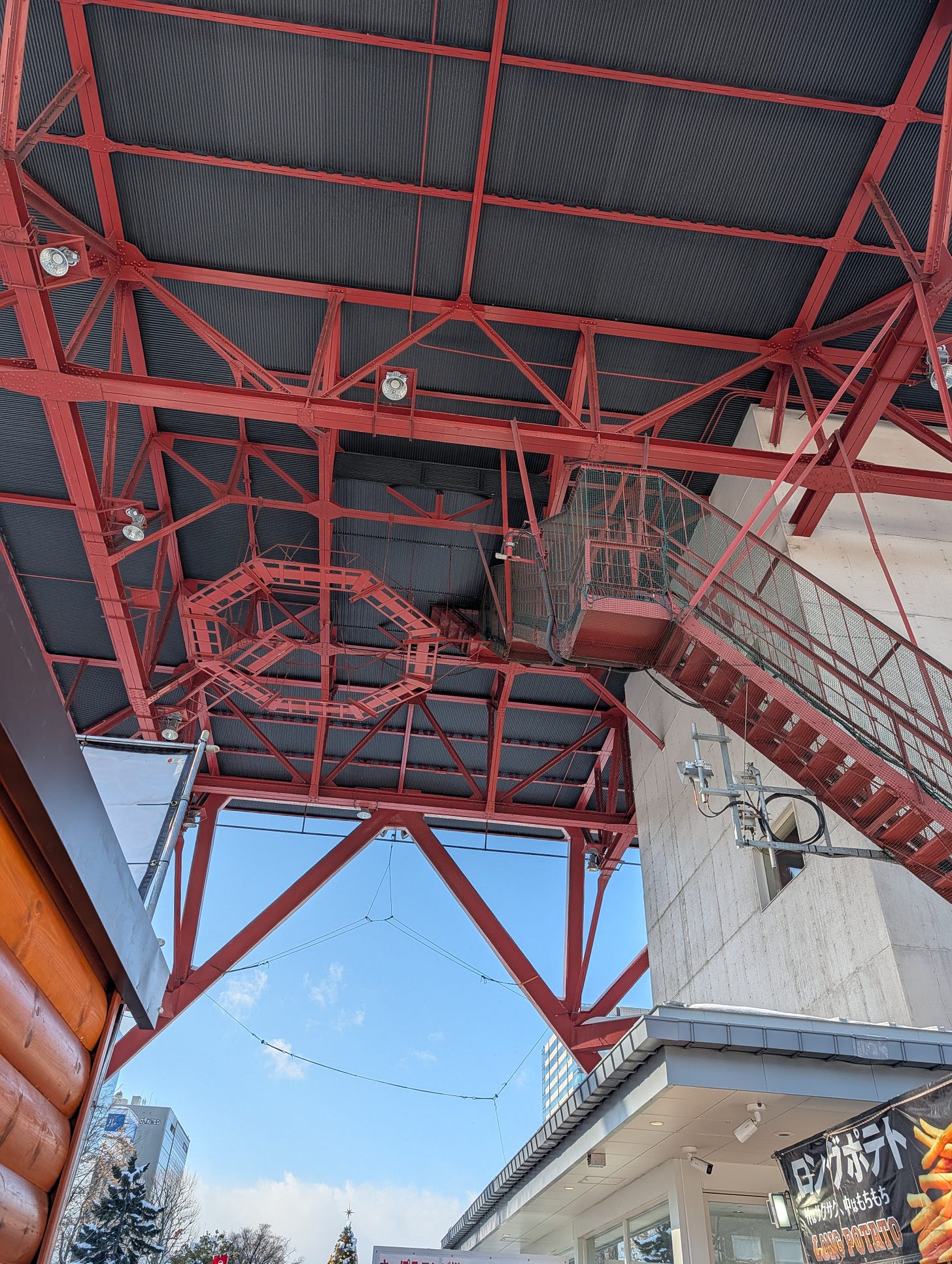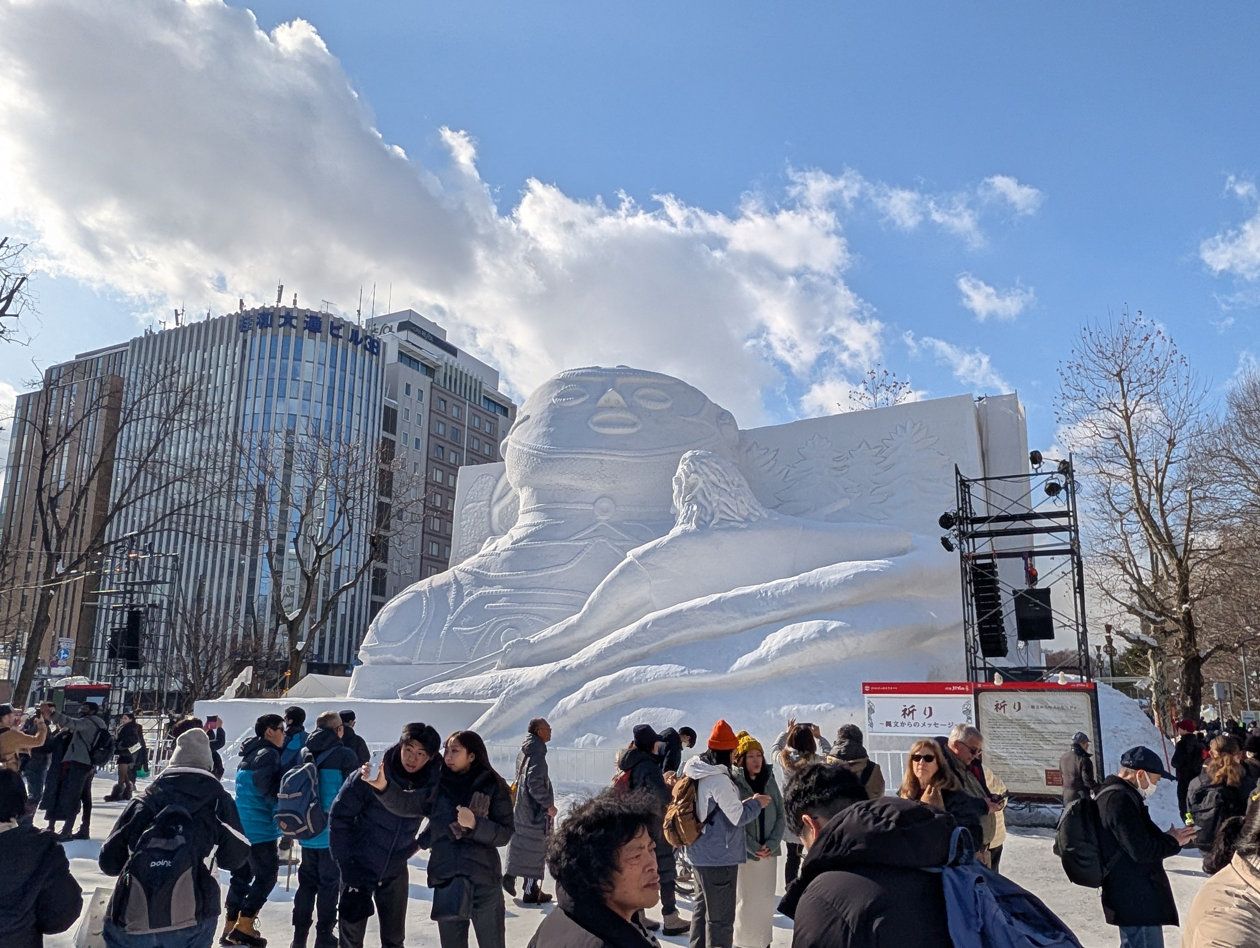 Odori park is an eleven-city-block majesty, which during this festival is thoroughly packed with large (and some enormous!) statues made of snow and peppered with additional activities and food vendors. The interesting thing about this festival compared to the other ones I’ve attended is the sponsorship mechanism - or rather, the many separate sponsorship mechanisms. At the Sapporo snow festival, everything from anime-style statues featuring characters from phone games, through videos playing advertisements, through an entire pavilion being sponsored by Shin Ramen (with a massive Coca-Cola building), there is an extensive network of braided sponsorship mechanisms that I assume is what funds the creation of multi-story snow lifts.