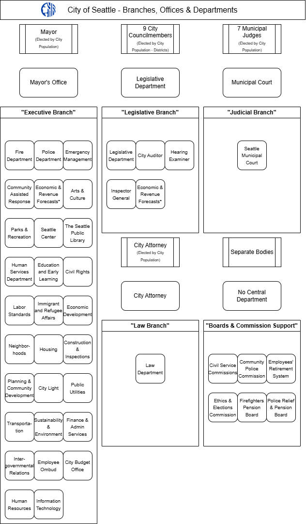 Resource: City of Seattle Branch -> Department + Office Organization DiagramA basic reference for The City of Seattle's Branches and which Departments + Offices are within them.Scot NelsonMar 15, 20262ShareVersion 1.0 (3.15.2026)- This could change, if certain entities are found to be reclassified, changed or introduced.