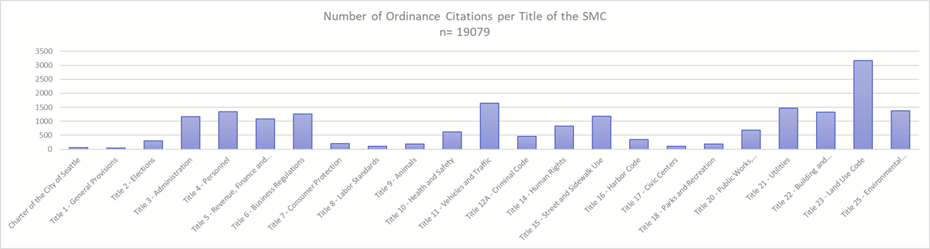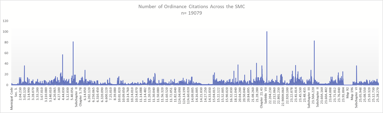 Not all of the titles in the SMC are created equally, though - some of them have a massive number of chapters and sections, but some (like Title 1 that I mentioned) have only a small number of very important sections. This extends to the landscape within each title too - some chapters are longer and have more sections than others, and some chapters are more prone to a high number of ordinance citations than others.