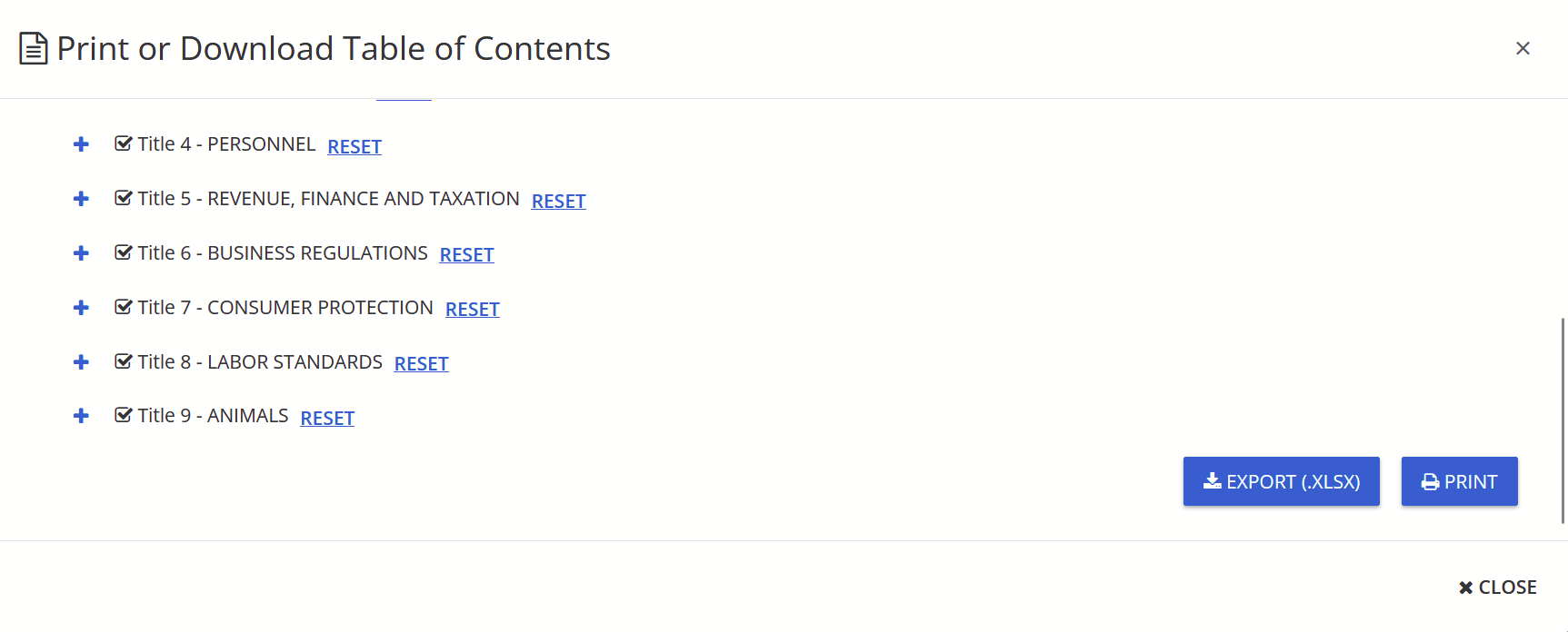 Municode, the platform that hosts the Seattle Municipal Code allows exports of the actual text of the Municipal Code by members of the public, located in the “Print or Download Table of Contents” menu (pictured below).