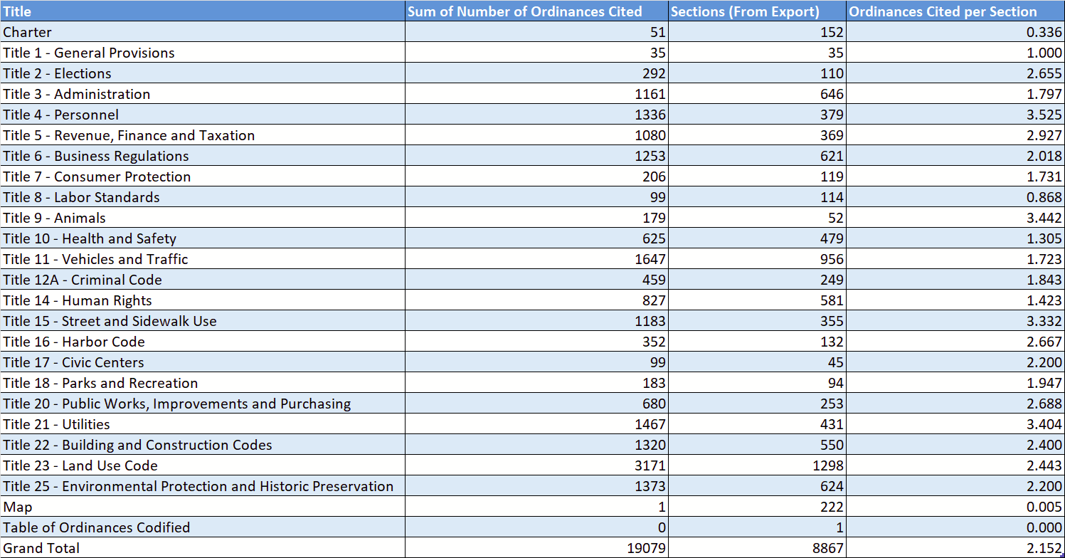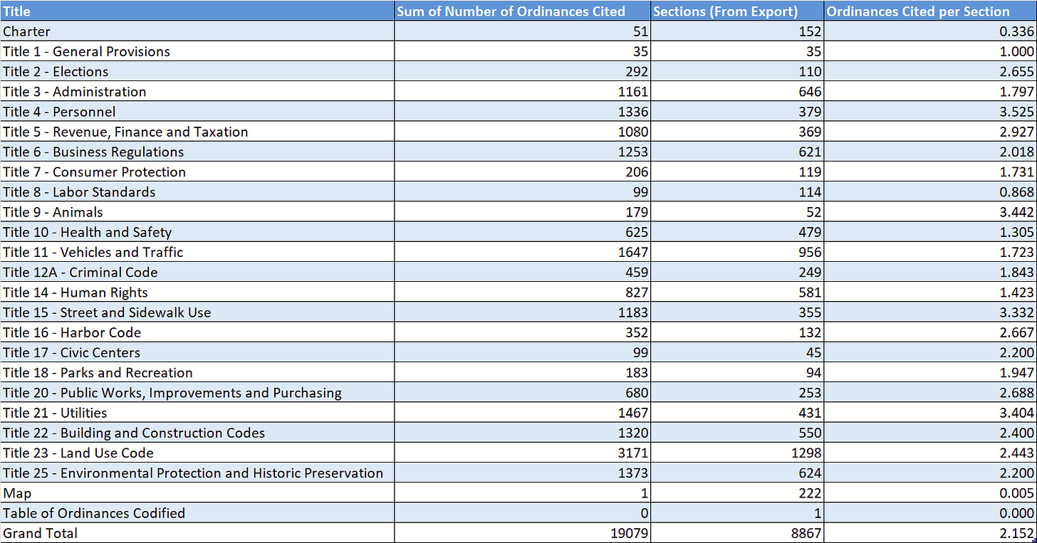 On the other end of the spectrum, Title 1, Title 8 and Title 10 have rates of ordinance citations that are close to 1, indicating that they may be “conserved” titles, unchanged since the ordinances that establish sections in these titles.